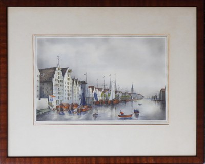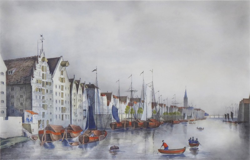 Ručně barevně kolorovaná litografie 22,5 cm x 35 cm. Podle kresby od: Friedrich Wilhelm Kohl (1811-1864), německý malíř. Pro litografický list nakreslil Georg Weinhold (1813-1880). Prvotně vytiskla firma J. Braunsdorf činná v Drážďanech v letech 1839 - 1873. Značeno pod paspartou - v tisku vlevo dole: d. Naturgez. v. F.W. KOHL. Uprostřed v dolní části: Druck von J. Braunsdorf a uprostřed dole název grafického listu: Bremen von der Nordwestseite der Weser. Vpravo dole: Lith. bei G. Weinhold in Dresden. Působivý pohled na přístav v Brémách ze severní strany řeky Weser (Vezera) s domy, plachetnicemi a malými loďkami. V originálním rámu s dekorem lakované ořechové dýhy s paspartou a sklem. Německo, Drážďany, kolem poloviny 19. století nebo první třetina minulého století. Celkový rozměr s rámem 44,5 cm x 55 cm.