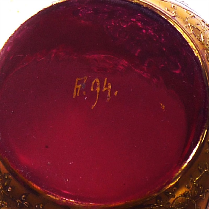 Kolem r. 1895, sklárna Moser, Karlovy Vary, značeno zespodu malovaným číslem, rubínové sklo bohatě dekorované zlatem a stříbrem (nebo platinou) a bílou barvou, výška 12 a 5,5 cm. Ref.: Potvrzeno archivem sklárny Moser, Karlovy Vary.