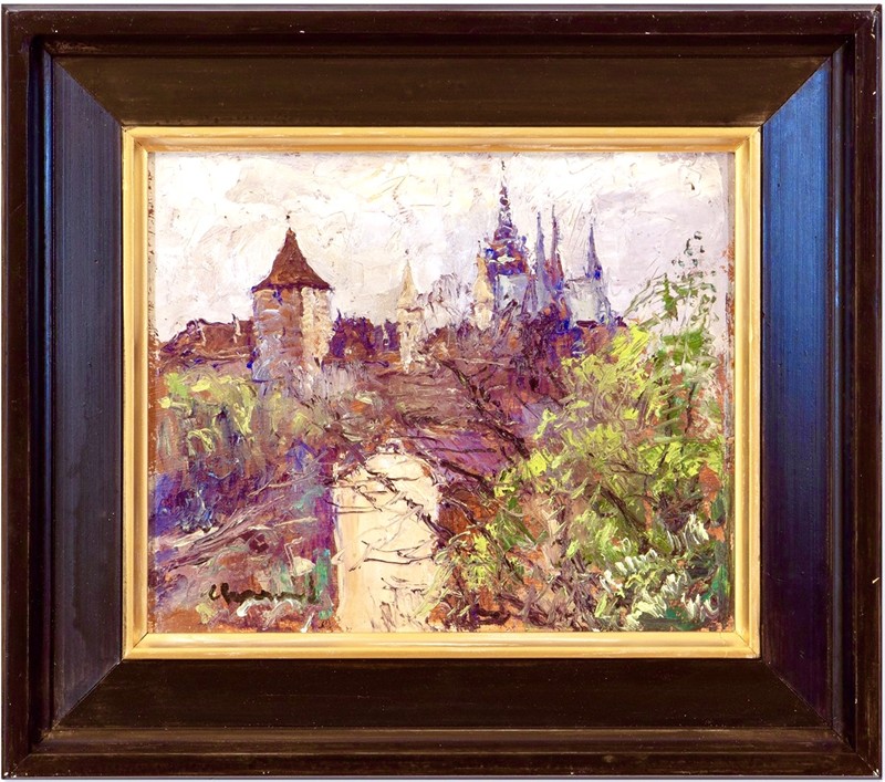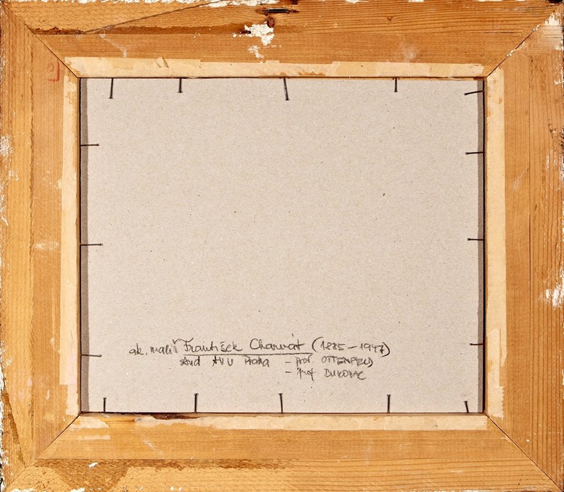 Olej na kartonu o velikosti 24 x 28,5 cm, signováno vlevo dole, rámováno. František Charvát (1885 - 1945) byl významný český malíř 1. pol.20. stol., studoval na Akademii výtvarných umění v Praze u prof. Ottenfelda a Rukovace. Svými díly je zastoupen v Národní galerii (Ng), SGVU Litoměřicích, vystavoval na celonárodních výstavách čsl. umění, často i s B.S.Urbanem.