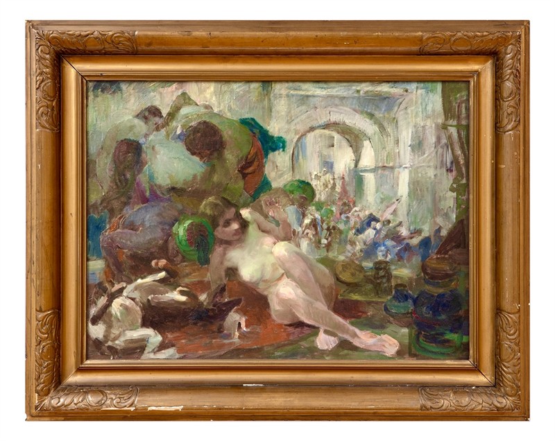 Olej na desce o velikosti 55 x 75 cm, signováno na rubu včetně pozůstalostního razítka, rámováno v původním dobovém rámu. František Jakub byl český akademický malíř především figurálních motivů, ale inportretů a krajin. Studoval na AVU v Praze u prof. Pirnera a Hynaise. Vystavoval v Rudolfinu s Krasoumnou jednotou, v Bienále v Benátkách a j. Byl členem JUV.