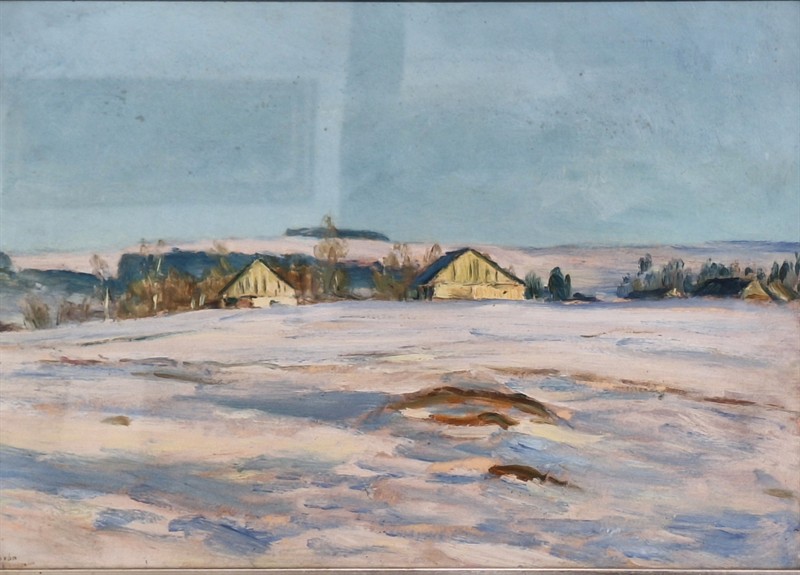 Olej na kartonu 27x37 cm. Původní stav. Signováno vlevo dole. Doba vzniku kolem roku 1910. Motiv - Horní Hradiště nad Vítanovem. Rám mírně poškozen .