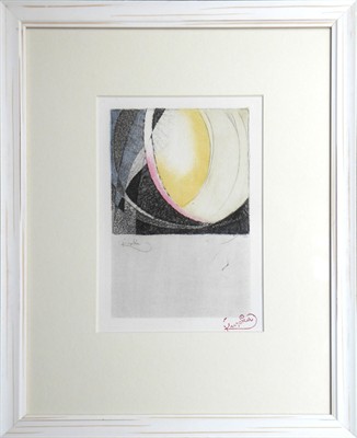 Barevný lept na papíru 225 mm x 145 mm. Signováno vlevo dole v tisku. Datováno vpravo dole v tisku 1913. Vlevo dole autorské razítko. František Kupka vystavil na pařížském Podzimním salonu v roce 1913 abstraktní díla Amorpha, Dvoubarevná fuga a Teplá chromatika. Krémově světlý rám s paspartou a sklem. Francie, rok 1913. Celkový rozměr s rámem 463 mm x 363 mm.