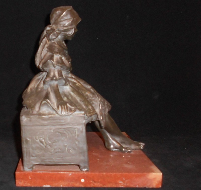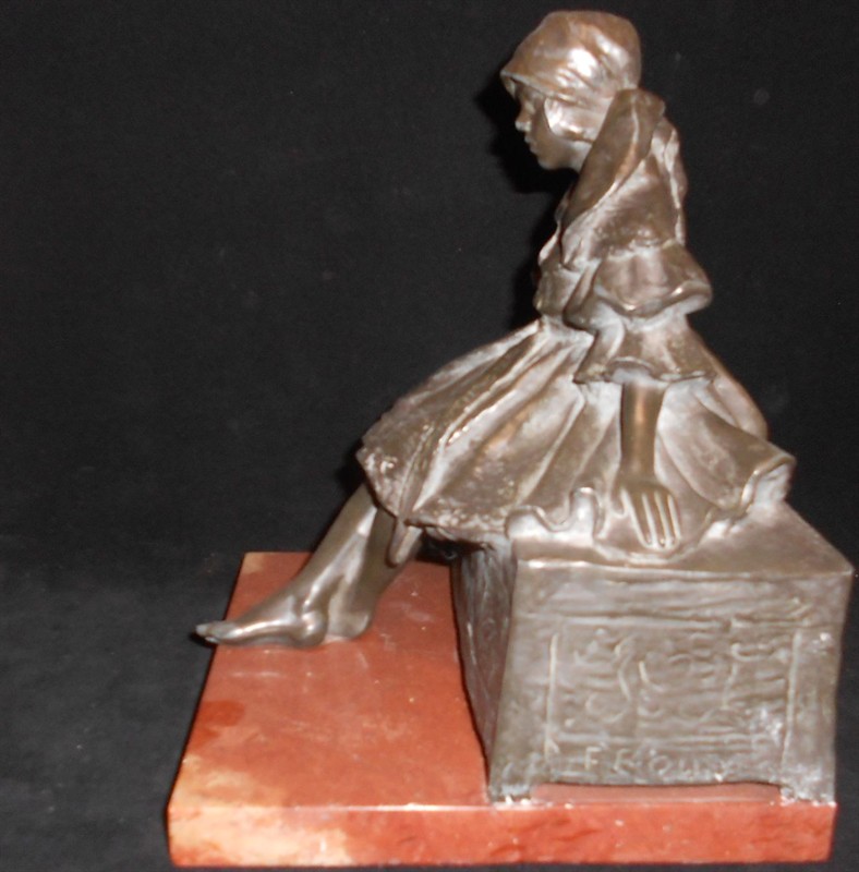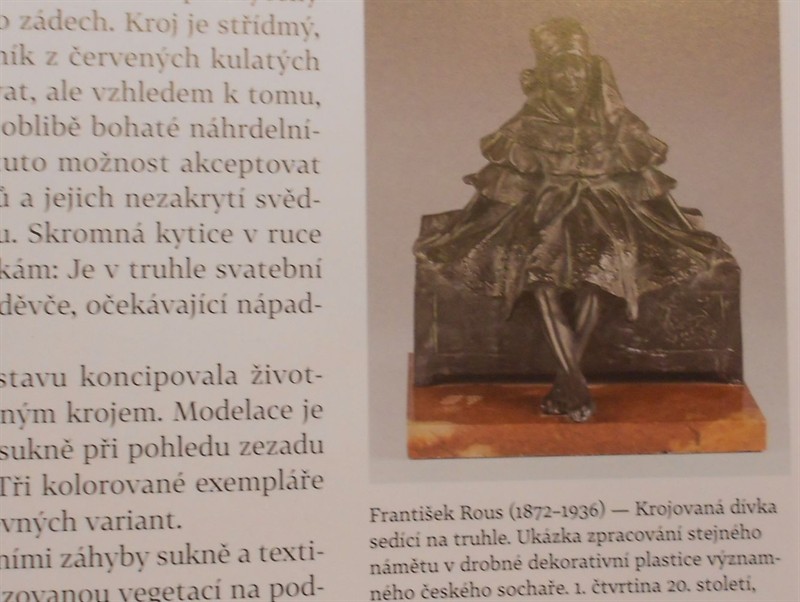 FRANTIŠEK ROUS - Krojovaná dívka sedící na truhle, bronz Bronzová plastika, původní odlitek. Výška 25 cm, k tomu podstavec ze sliveneckého mramoru 2 cm, celkem 27 cm. Výborný stav. Publikováno v monografii Heleny Johnové (srovnání s obdobnou prací této keramičky). Krásný odlitek , od významného českého sochaře ze začátku 20. století František Rous (1872-1936), sochař, studia v Německu, Paříži, Vídni. V soutěži o pomník sv. Václava skončil třetí za Myslbekem a Schnirchem.