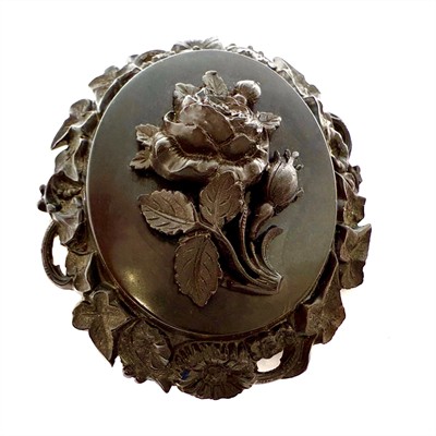Půvabná brož větších rozměrů zhotovená počátkem 20.století. Šperk zdobí plasticky vyřezaný motiv růže. Rozměry cca 5,5 x 5,5 cm. Výborný stav.