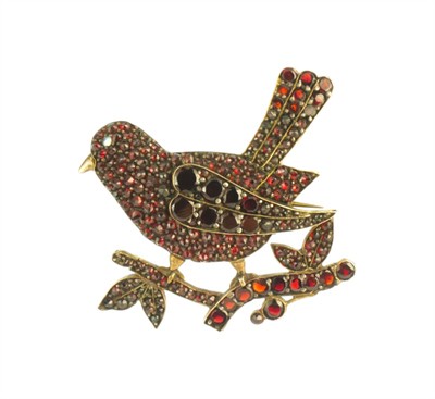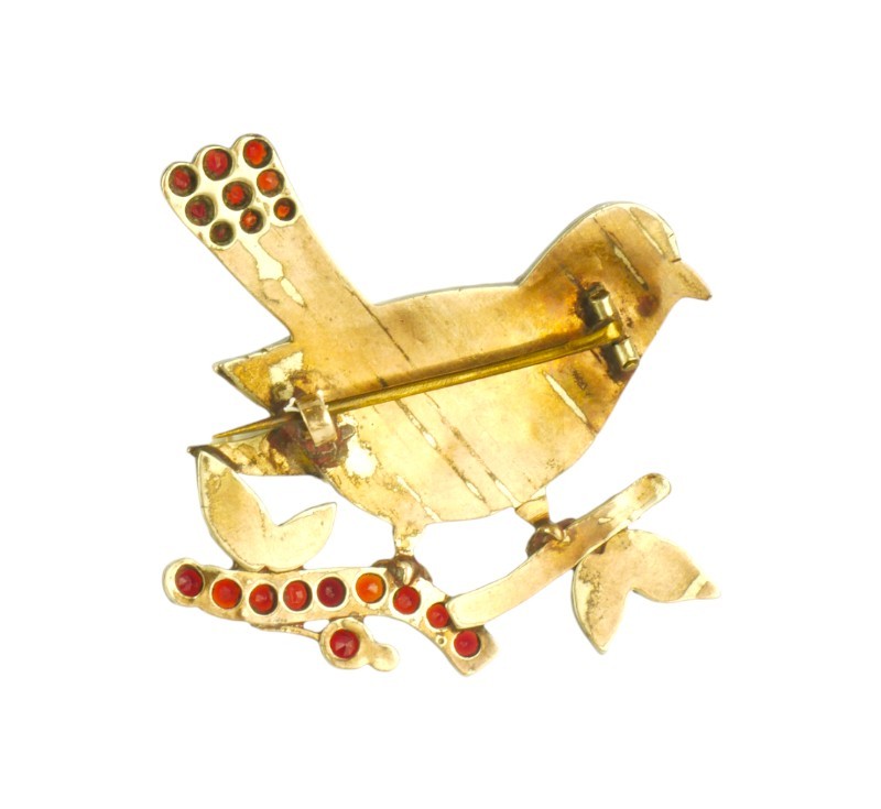 Brož ve tvaru ptáčka zhotovená z tombaku je osázená českými granáty. Rozměry brože jsou 5,5 x 4 cm. Krásný zachovaly stav, velmi dekorativní,