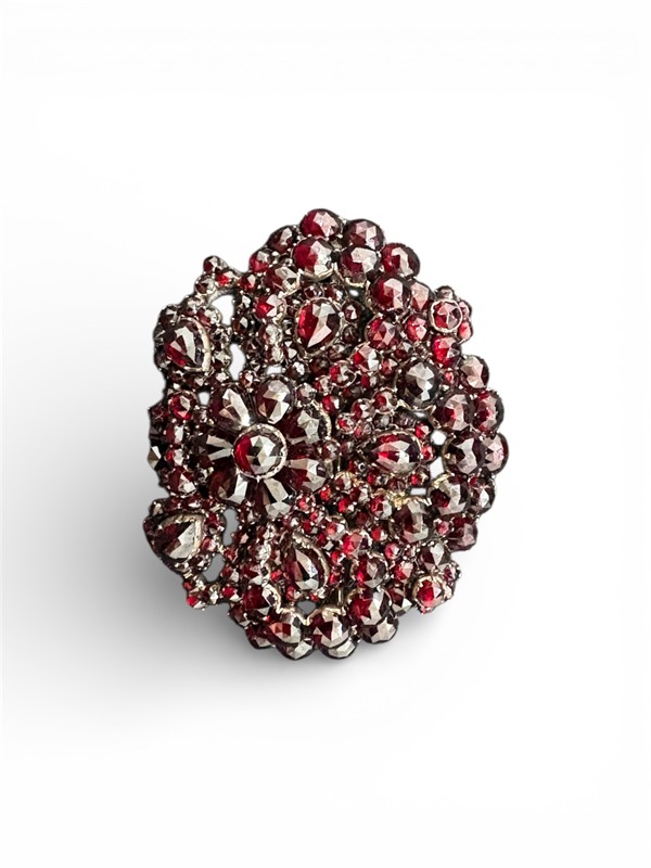 Brož s českými granáty v tombaku. Čechy, 2. polovina 20. století. Zezadu opravováno. Velikost: 5,5 x 4 cm.