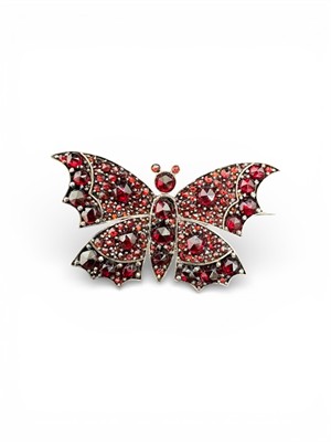 Brož s českými granáty v tombaku ve tvaru motýla. Velikost: 4 x 2 cm. Čechy, 2. polovina 19. století.