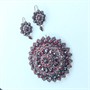 Starožitná souprava s českými granáty, v původní etuji, brož a náušnice, Čechy, 19. století, český granát, tombak průměr brože 4,5 cm, délka náušnic 2,8 cm