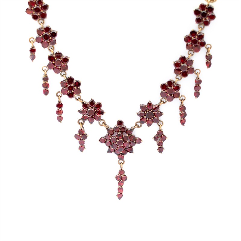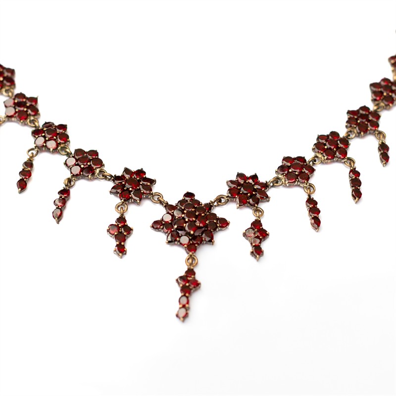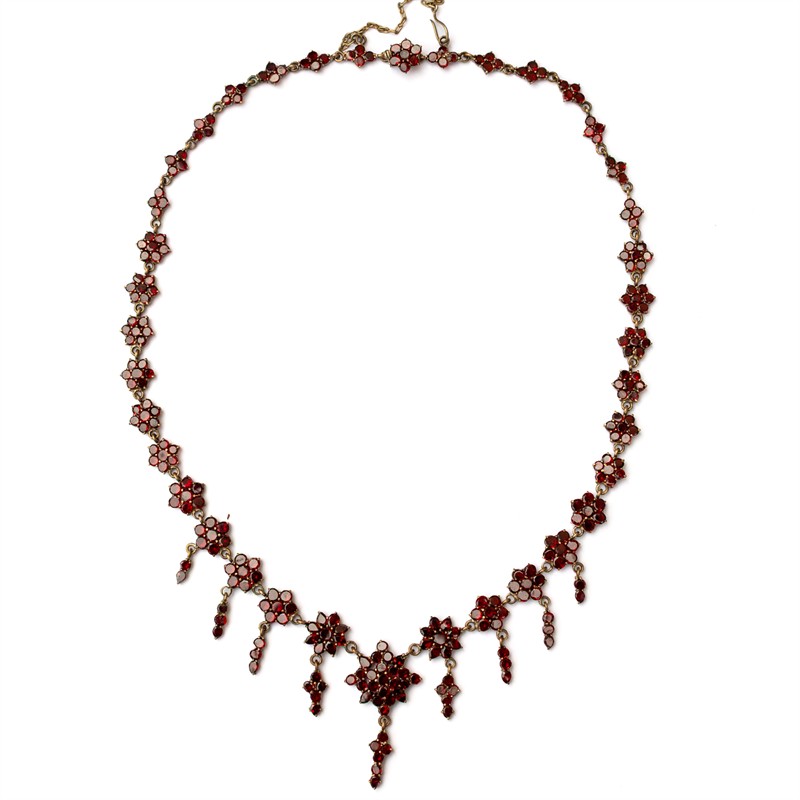 Starožitný granátový náhrdelník, Čechy, kolem roku 1880, český granát, tombak, délka náhrdelníku cca 47 cm