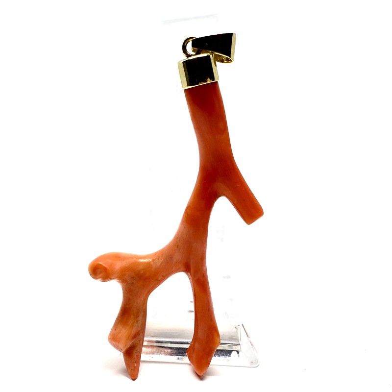 Originální závěs zhotovený z mořského korálu sytého lososovitého odstínu. Zavěšení šperku vyrobeno ze 14ti karátového zlata 585/1000. Celková váha 11,73 g. Rozměry cca 8,5 x 3 cm. Výborný stav. Řetízek není součástí prodeje.