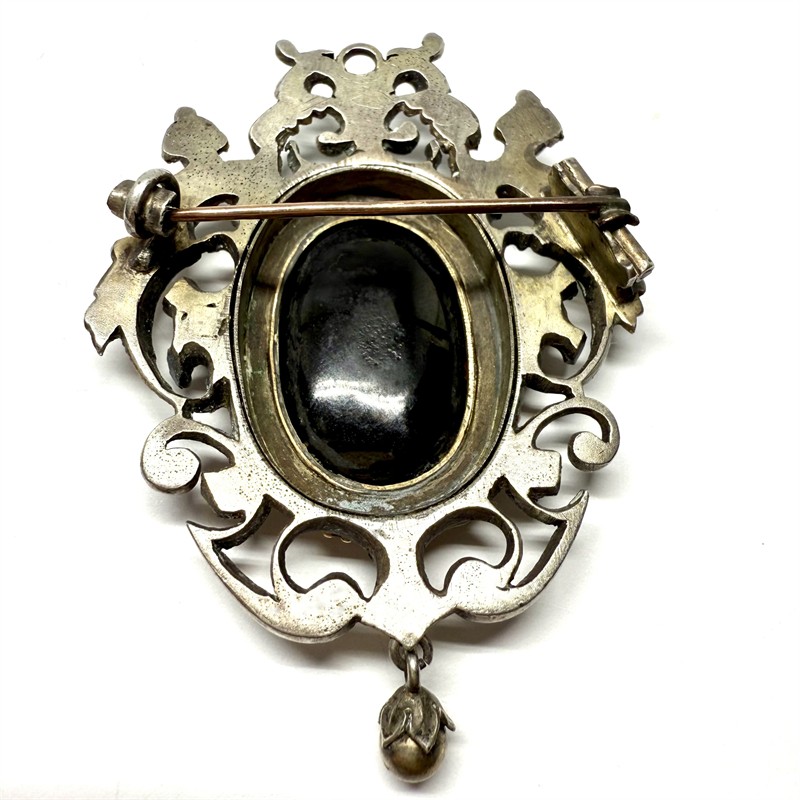 Unikátní, sbírková, velmi stará brož větších rozměrů. Šperk byl zhotoven ze stříbra ryzosti 800/1000 v kombinaci se zlatem 14ti karátovým. Osvědčení Puncovního úřadu. Brož má symetrickou kompozici s bohatým ornamentem, motivy volut a dvojici ženských postav po stranách - typické prvky neorenesančního nebo neobarokního šperkařství. Broži vévodí malba šlechtičny zhotovená ve smaltu, orámovaná trojitým, zlatým rámečkem. Dojem umocňují dva velmi drobné, též ve zlatě zasazené rubíny a dvě říční perly. Rozměry 6,5 x 4,5 cm. Výborný stav.