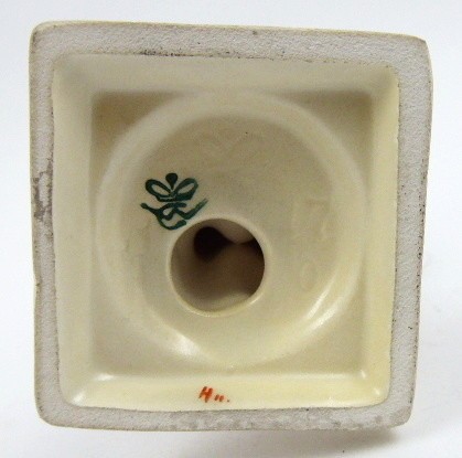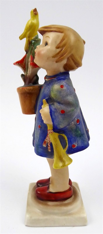 Ručně malovaná keramika. Světoznámá firma W. Göbel Porzellan, kolekce Hummel, Oeslau. Návrh: Reinhold Unger (1880-1974). Datace: rok 1935. Název figury: Ich gratuliere (Gratuluji). Tato figurka z kolekce Hummel je publikována v knize - Dieter Struss: M.I. Hummel Figuren. Vydané nakladatelstvím Battenberg v Augsburgu v roce 1993. Strana 86 obrázek HUM 17, vlevo dole popis. Dívenka v modrých šatech s červenými puntíky s trumpetkou převázanou mašlí v levé ruce a v pravé gratulující s velkou květinou v květináči, na níž sedí žlutý zpívající ptáček. Ručně malovaný obličej i další části. Na nízkém čtverhranném podstavci. Značeno zespodu: značka firmy, vtlačená čísla a značka malíře. Německo, Oeslau 1935 - 1950. Výška 15,5 cm.