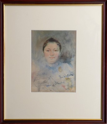 Akvarel na papíru 19 cm x 13 cm. Signováno vpravo v dolní části s názvem a datací 1892. Portrét mladé ženy s přezdívkou či jménem Schopka v pastelové barevnosti. V jednoduchém hnědém rámu se zlacenou vnitřní lištou, nově paspartováno a zaskleno. Německo, Mnichov, rok 1892. Celkový rozměr s rámem 38 cm x 32 cm.