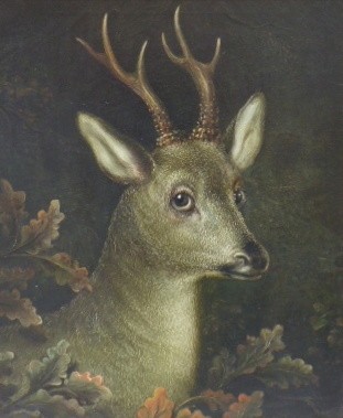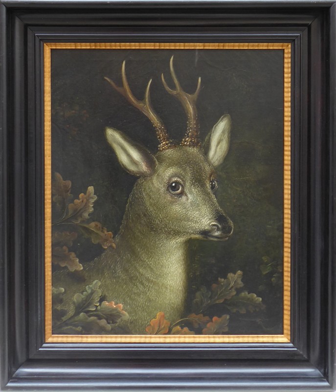 Olej na plátně 68 cm x 55 cm. Hlava srnce na silném krku s parožím šesteráka tzv. křižáka na tmavém pozadí. U srnce se jedná o raritní trofej. Listy dubu v podzimních barvách dekorují spodní část obrazu. Ve vkusném černě mořeném profilovaném rámu s vrubovanou světlou lištou. Střední Evropa 1840 - 1880. Celkový rozměr s rámem 83 cm x 71 cm.
