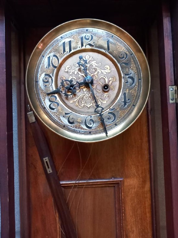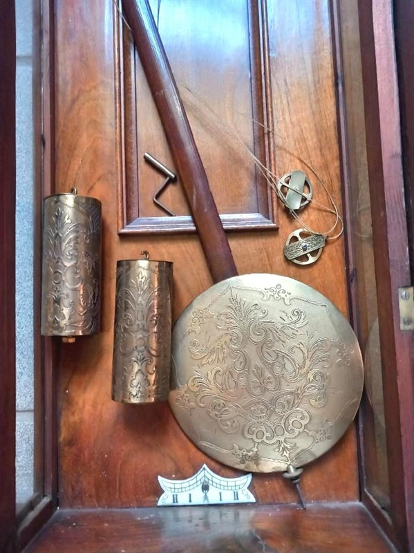 Hodiny zdobené bohatou řezbou v horní části, zdobeným ciferníkem, zdobenými závažími a kyvadlem jsou funkční.Hodiny měří na výšku 120 cm, na šířku 42 cm, hloubka hodin je 20 cm. Hodiny bijí v půl a v celou. Mají příjemný zvuk.