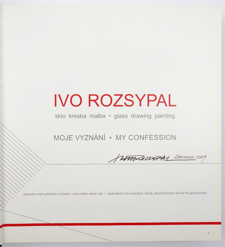 Rozsáhlá výpravná monografie s vlastnoručním podpisem autora s datací červenec 2009. Publikace vydaná v roce 2009 akademickým malířem Ivo Romanem Vojtěchem Rozsypalem v Novém Boru pod názvem: sklo kresba malba - glass drawing painting s podtitulem "Mé vyznání". Komplexně autorské dílo včetně textů, fotografií i grafické úpravy. Ivo Rozsypal (1942-2021). Česká republika, Nový Bor, rok 2009. Rozměr: 33 cm x 30,5 cm.