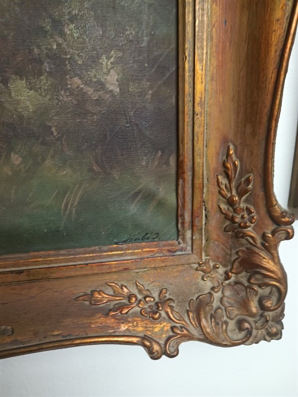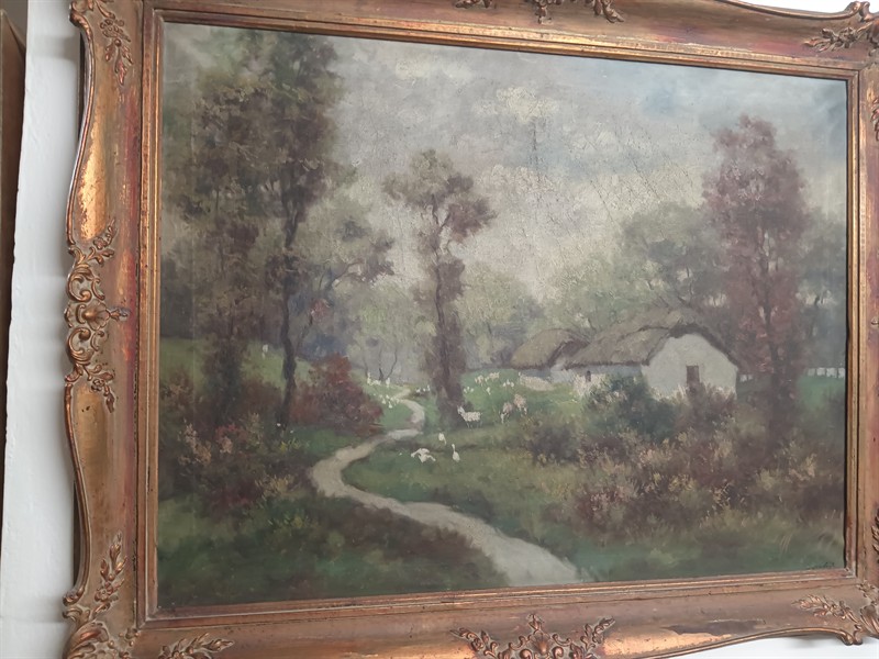J.Szabo , olej na plátně, krajina s chalupou. Obraz je v původním nerestaurovaném stavu . Krásný vyřezávaný rám . Vnitřní rozměry 80 x 60 cm.