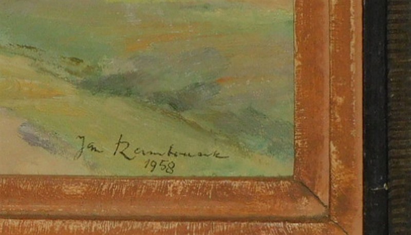 Jan Rambousek (1895 -1976) - Cesta ke Spořilovu. Olej na překližce, signováno vpravo dole Jan Rambousek 1958, 35 x 45 cm, původní rám. Na zadní straně popsáno autorsky - viz foto. Autor byl učitelem na Akademii, asistentem Maxe Švabinského, autorem mnoha knih a článků, jeho specializací byla grafika se sociální tématikou. Olejomalby jsou spíše vzácné.