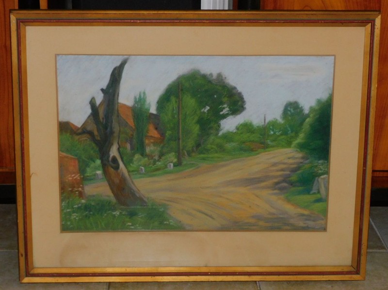 Jan Rambousek (1895 -1976) - Cesta u chalupy. Pastel na papíru, signováno vpravo dole tužkou hůře čitelně, 35 x 52 cm, pasparta, sklo, rám. Autor byl učitelem na Akademii, asistentem Maxe Švabinského, autorem mnoha knih a článků, jeho specializací byla grafika se sociální tématikou.