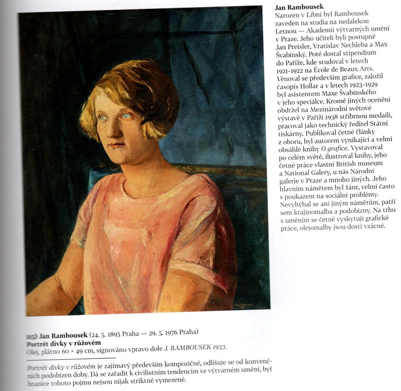 Jan Rambousek (1895-1976) - Portrét dívky v růžovém Olej, plátno 60 x 49 cm, sign. vpravo dole J. Rambousek 1933. Rámováno, výborný stav. Obraz byl vystaven v Prácheňském muzeu v Písku 2023, je publikován v knize Pojďme mezi lidi str. 199. Autor byl učitelem na Akademii, asistentem Maxe Švabinského, autorem mnoha knih a článků, jeho specializací byla grafika se sociální tématikou. Olejomalby jsou spíše vzácné.
