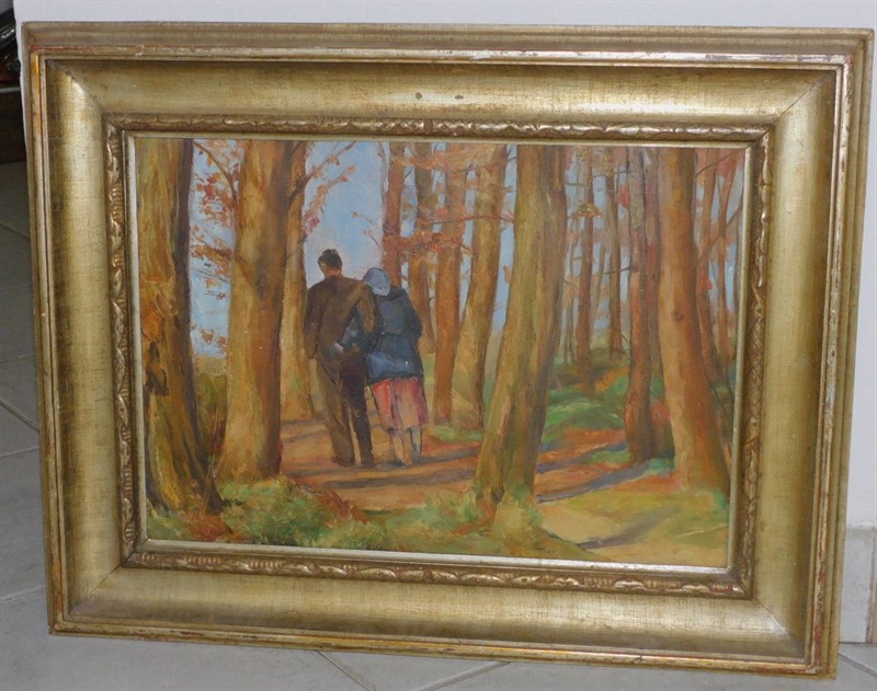 Jan Rambousek (1895 – 1976) – Dvojice v lese. Olej na kartonu, rozměr 30 x 43 cm, nesignováno, rám. Autor byl učitelem na Akademii, asistentem Maxe Švabinského, autorem mnoha knih a článků, jeho specializací byla grafika se sociální tématikou. Olejomalby jsou spíše vzácné.