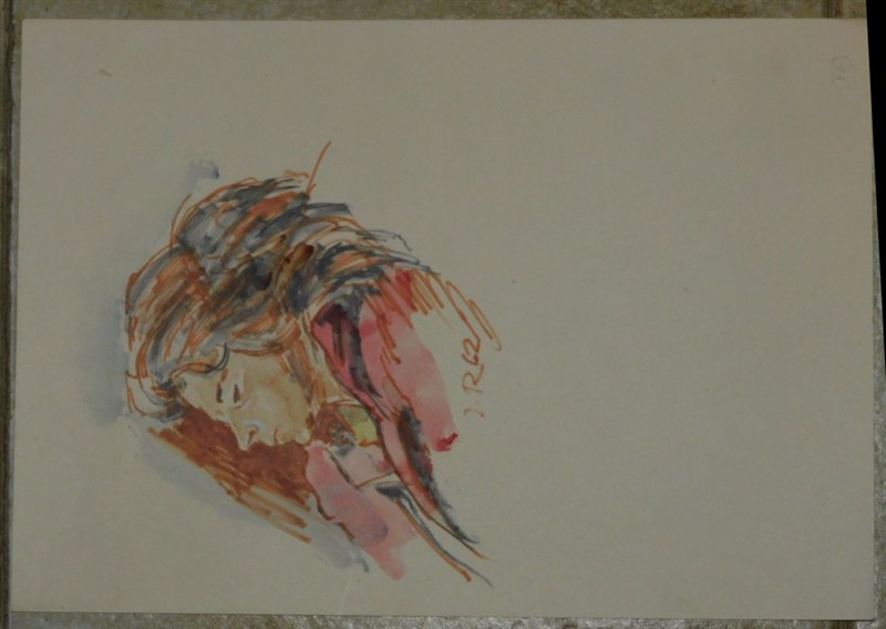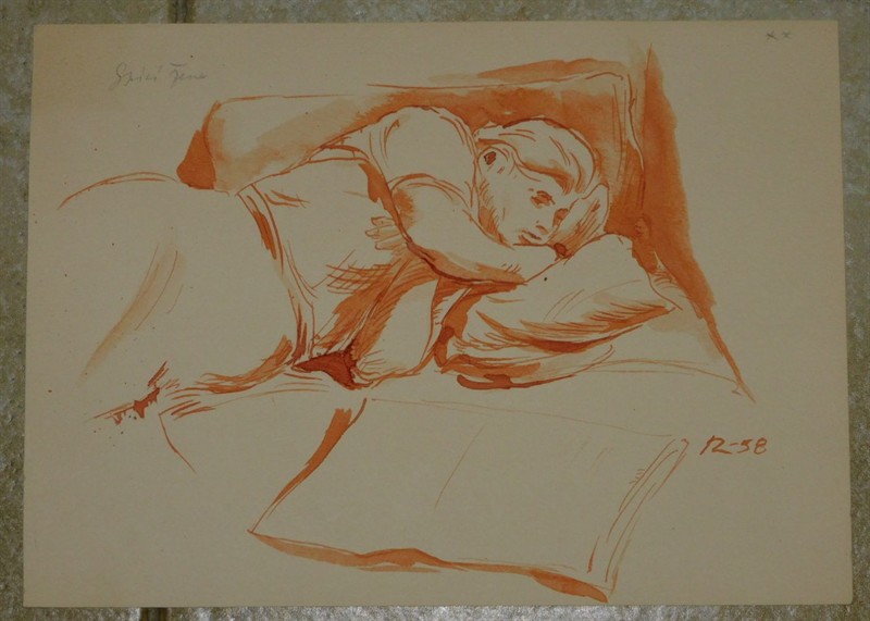 Jan Rambousek (1895 -1976) – Spící žena. Akvarel (kresba lavírovaná sépií), papír, signováno vpravo dole R- 58. Rozměr 21 x 29 cm, volný list, nerámováno. Jan Rambousek (1895 -1976) – Spící dívka. Akvarel, papír, signováno vpravo dole J. R. 62. Rozměr 30 x 22 cm, volný list, nerámováno. Autor byl učitelem na Akademii, asistentem Maxe Švabinského, autorem mnoha knih a článků, jeho specializací byla grafika se sociální tématikou.