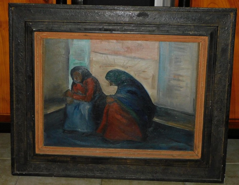 Jan Rambousek (1895 -1976) - Staré ženy. Olej na překližce, signováno vpravo dole monogramem, 40 x 60 cm, původní rám. Na zadní straně popsáno autorsky - viz foto. Autor byl učitelem na Akademii, asistentem Maxe Švabinského, autorem mnoha knih a článků, jeho specializací byla grafika se sociální tématikou. Olejomalby jsou spíše vzácné.