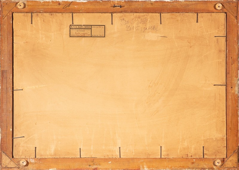 Vystavovaná velká kombinovaná technika na kartonu o velikosti čisté malby 36 x 60 cm. Rámováno v paspartě pod sklem. Na rubu výstavní štítek KVU Aleš k výstavě “Umělci národu” z roku 1942 s popisem díla. Jan Sládek (1906-1982) byl významný český malíř původem z Ostravy, byl řádným členem Spolku Mánes v Praze, SVUM v Ostravě. Zastoupen je sbírkách GVU v Ostravě, Národním muzeu a j.