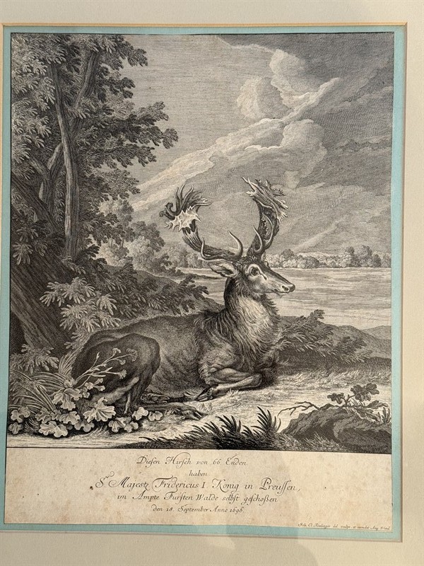 Jelen střelený v roce 1696 jeho vísostí králem Fridrichem Pruským. Ze souporu unikátních jelenů, střelených evropskou šlechtou. Kolem roku 1740. Rytina se sytým otiskem, oříznuta až do kraje 45,5 x 54 cm, rámována pod sklem. Ridinger 1698 - 1767, se stal svým dílem nejslavnějším barokním mistrem ve zpodobňování lovné zvěře, koňů, kronikářem v uměleckém ztvárnění všech způsobů lovu tehdejší doby,. Jeho rytiny můžete obdivovat na mnohých českých hradech a zámcích. U šlechty byl velice oblíbený.