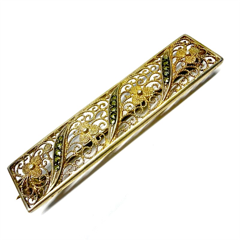 Velmi půvabná, jemná brož z decentně zlaceného stříbra. Šperk nese půvabný florální motiv provedený pracnou technikou filigránu, zdobeno decentními markazity. Stříbro ryzosti 800/1000. Jehla z funkčních důvodů obecný kov. Celková váha 4,41 g. Rozměry cca 5 x 1 cm. Šperk vynikne především na tmavém, jednolitém povrchu. Výborný stav.