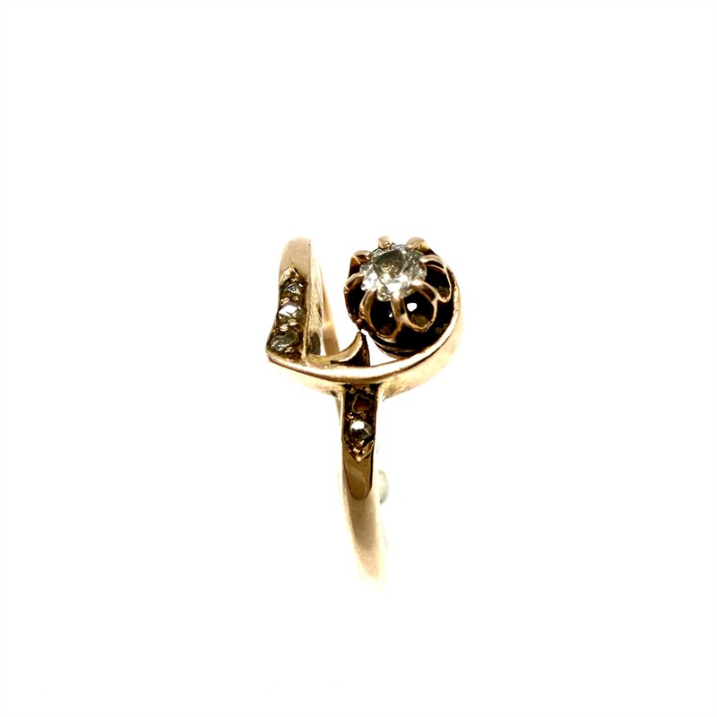 Půvabný, velmi jemný prsten zhotovený v první polovině 20.století v secesním stylu. Šperk je vyroben ze zlata tmavšího narůžovělého odstínu ryzosti 585/1000. Velikost 53. Prsten zdobí briliant starého brusu o váze cca 0,10 ct a pět drobných diamantových rout. Váha 1,76 g. Starý, autentický šperk ve výborném stavu.