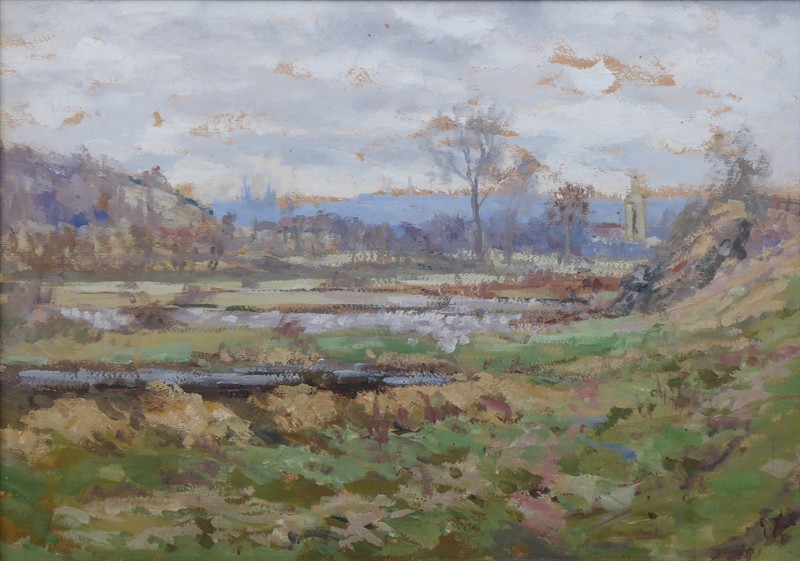 Olej na kartonu 29 cm x 42 cm. Vzadu originální štítek se jménem autora a názvem obrazu. A štítek rámařství, které obraz nově zarámovalo. Autor: Jindřich Stehlík (1905-1991). Motiv ticha uprostřed zeleně přírody za Prahou. Na horizontu věže připomínající blízkost rušného velkoměsta. Nově zarámováno v úzkém rámu s patinou měděné barevnosti. Československo 1950 - 1970. Celkový rozměr s rámem 33,5 cm x 46,5 cm.