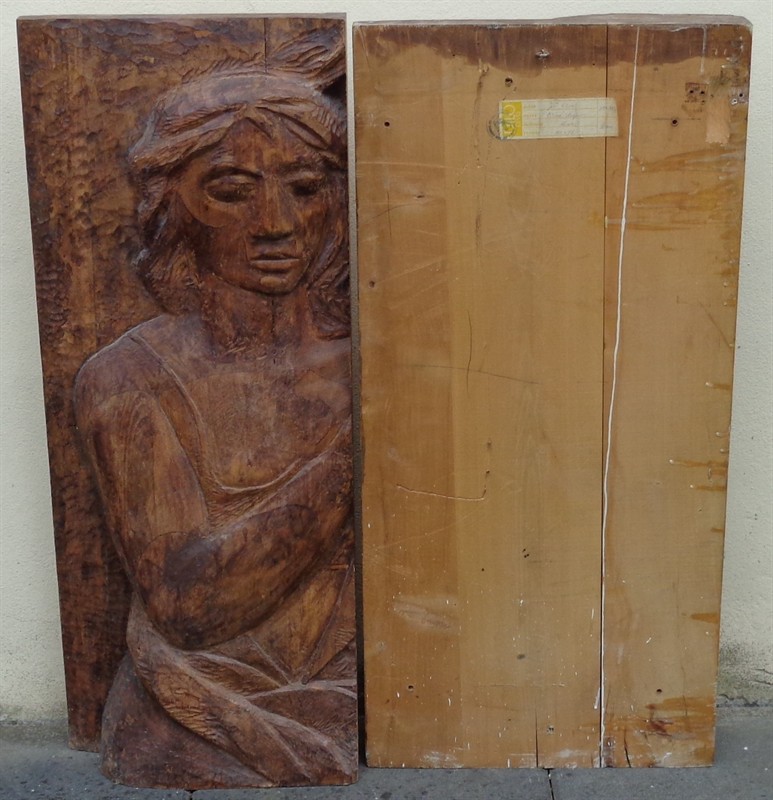 Rozměrný,závěsný,doudílný dřevořez,od ak.sochaře Jiřího Kleina (nar.14.10.1939 Slaný - 1989 Praha Strašnice),studia SPŠ sochařsko-kamenická v Hořicích a AVU Praha u prof.K.Hladíka,celkový rozměr 105x92 cm,na zadní straně původní,originální štítek s razítkem Českého fondu výtvarných umělců,jménem autora,názvem díla a původní cenou.