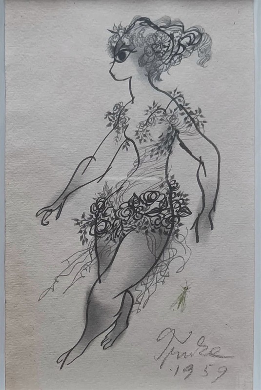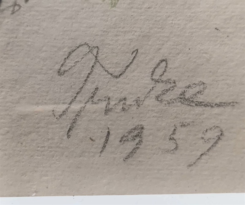 Rozměr 18 x 11,5 cm. Pasparta, sklo. Signováno a datováno 1959. Nepoškozeno.