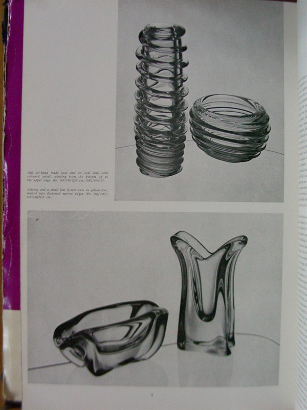 návrh 1958, provedení Borské sklo, sklárna Chřibská, model č. OK/149/1/24, výška 24,5 cm, růžové sklo se zeleným jádrem, opředené spirálou z čirého skla . Lit.: Glass Review. 1958, sv. 13, č. 11, s. 2-8, obr. na s. 8.