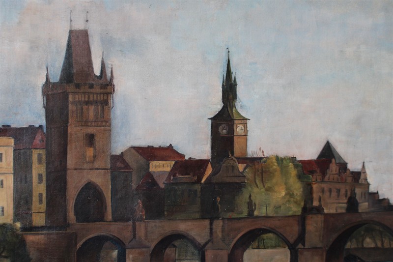 Josef Hubáček (1899 - 1931) Pohled na Malou Stranu 1929  Signováno viz foto. Český akademický malíř, známý především svými krajinomalbami. Studoval na Uměleckoprůmyslové škole v Praze u profesora Arnošta Hofbauera a následně na Akademii výtvarných umění v Praze pod vedením profesorů Augusta Brömse a Otakara Nejedlého.  Olej na plátně. Rozměry malba: 82 x 101 cm.