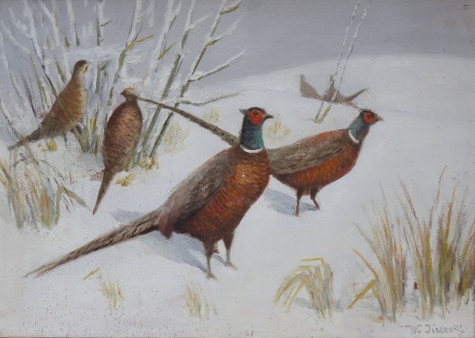 Olej na kartonu 50 cm x 69 cm. Signováno vpravo dole. Autor obrazu: Karel Walter Jizerský (nar. 1892). Zimní scenérie párů bažantů a koroptví na sněhové pláni. Originální zlatý rám s reliéfní zdobnou horní lištou. Na malbě místy tečky od hmyzu. Československo 1920 - 1940. Celkový rozměr s rámem 59 cm x 78,5 cm.