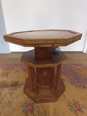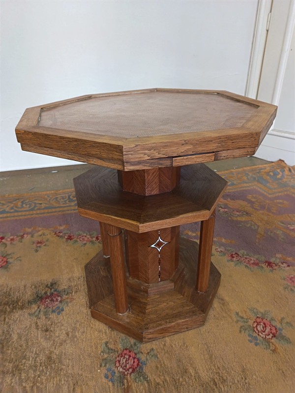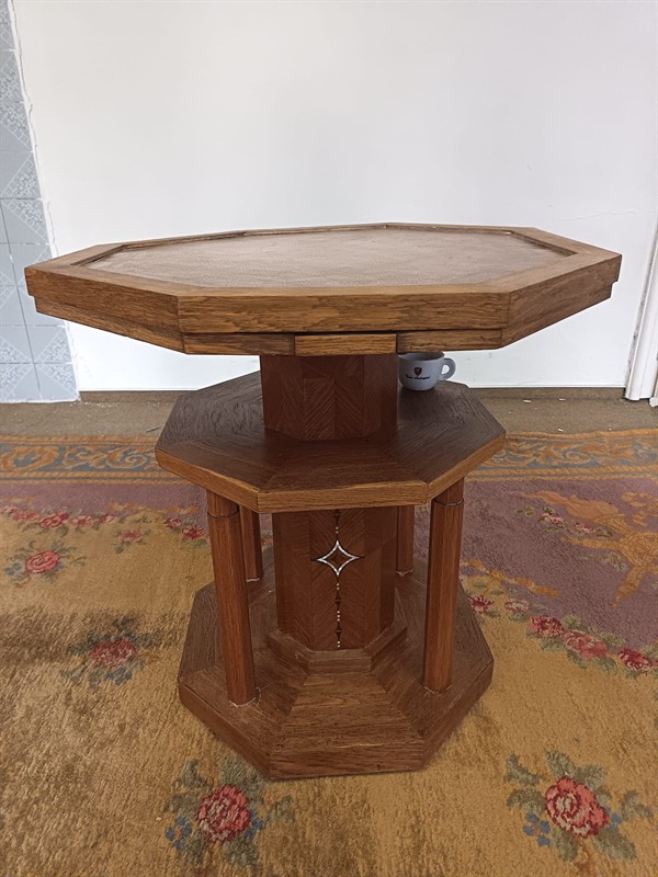 velmi praktický karetní stůl p.desry 80cm v.78cm dubová dýha ,měd ,perleř