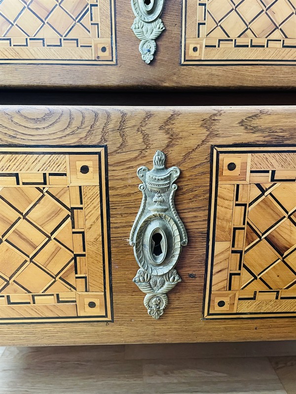 Prádelník ( komoda) , dvě zásuvky, bohatá geometrická intarzie do masivu, 2.polovina 18. století. Výška 90 cm, šířka 124 cm, hloubka 64. Hezký stav.