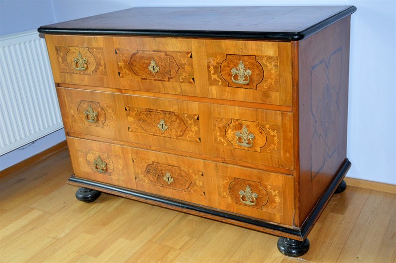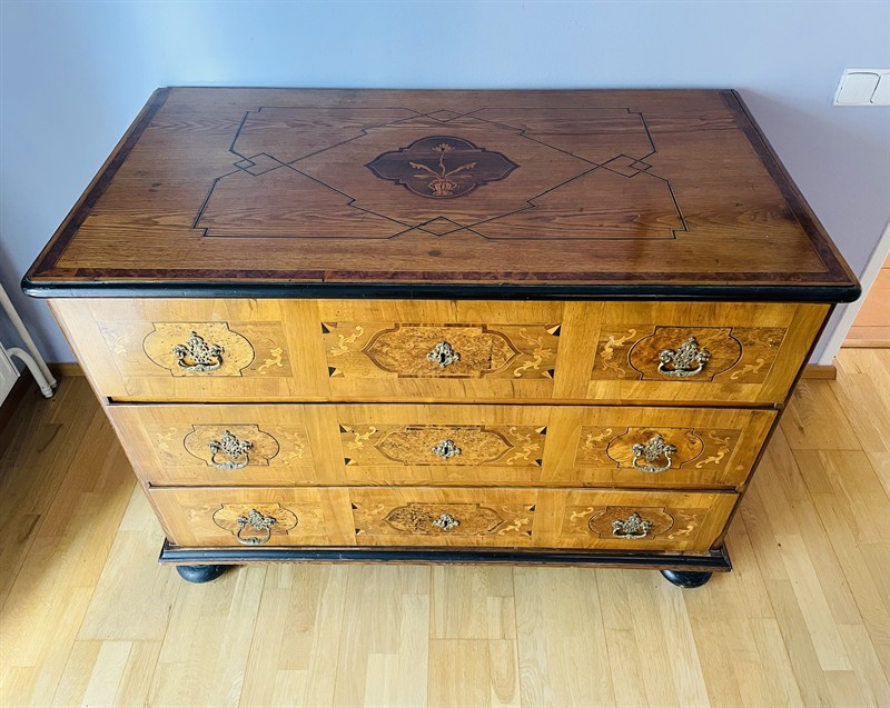 Intarzovaná komoda/prádelník, začátek 18. století. Výška 86 cm, šířka 121 cm, hloubka 67 cm. V krásném stavu. Doprava vlastní nebo po domluvě.
