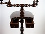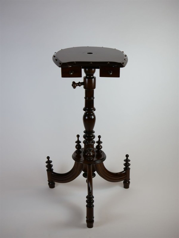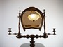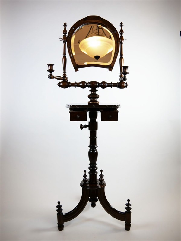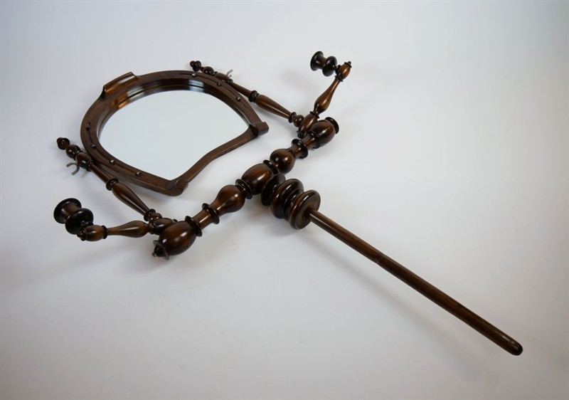 malá dřevěná rozkládací polohovací toaletka s vyklápěcím zrcadlem ve tvaru koňské podkovy s ozdobnými hřeby, podobně je ve tvaru podkovy provedená odkládací část se dvěma šuplíčky, ořechový masiv, střední Evropa, kolem roku 1890, u zrcadla dva pohyblivé stojánky na svíčky; výška 138 cm, šířka 47 cm; povrchově ošetřeno přírodní šelakovou politurou; sběratelsky zajímavé, především pro příznivce jezdectví a chovu koní