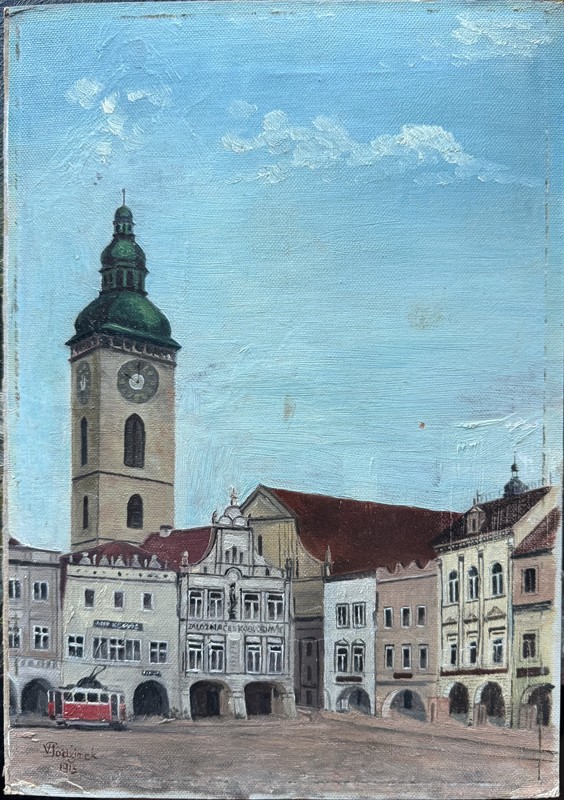 4 olejomalby z období 1880-1940: 1. Pavel Raszka: motiv z Vysokých Tater, olej na plátně o velikosti 40x50 cm, signováno vpravo dole 2. V. Podzimek: Náměstí v Českých Budějovicích (1913), olej na plátně fix.na kart. velikost 36x25 cm 3. Alpská krajina s jezerem z konce 19.století, olej na plátně na blindrámu, nesignováno, velikost 40x30 cm 4. Neurčený malíř přelomu 19.a 20.století: “Skály v horách”, sign.vpravo dole, plátno fixované na kartonu, velikost 30 x 40 cm