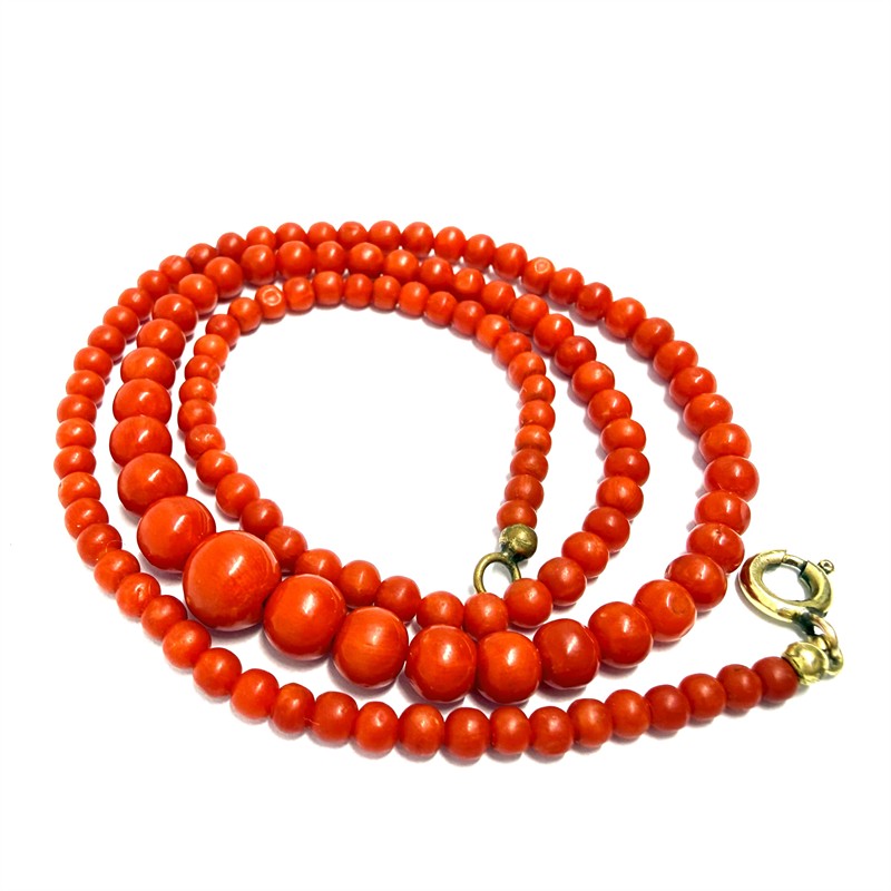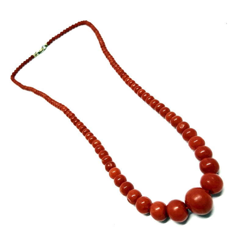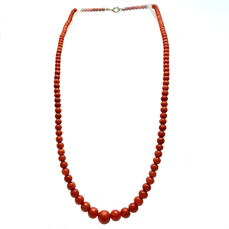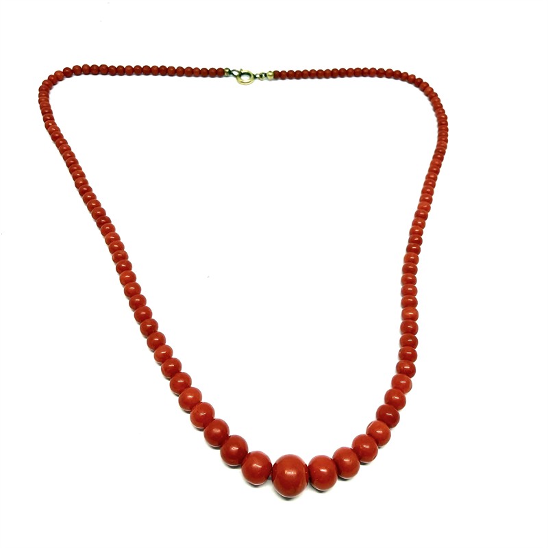 Půvabný náhrdelník zhotovený z červených, dokulata vybroušených korálů. Náhrdelník je dlouhý 46 cm, korály se směrem ke středu zvětšují. Průměr korálů 2 - 7 mm. Zapínání ze zlaceného obecného kovu. Výborný stav.