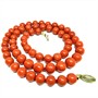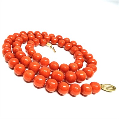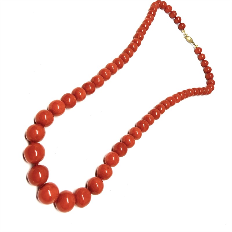 Výrazný náhrdelník z velkých, mimořádně kvalitních červených korálů. Korály mají výrazný červenooranžový odstín a každý z nich je precizně prouzlíkovaný. Průměr cca 7 mm. Elegantní zapínání ze zlaceného stříbra ryzosti 835/1000. Délka cca 50 cm. Perfektní stav.
