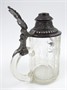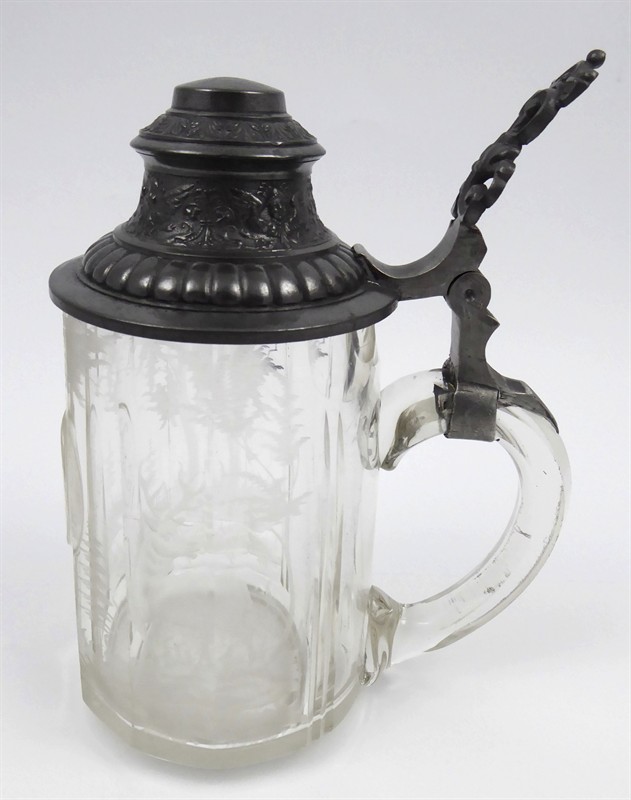Čiré ručně broušené sklo, cín. Korbel s ručně broušenými svislými fazetami a centrálním reliéfním medailonem se stylizovaným písmenem H. Po stranách medailonu ručně rytý výjev jelena na pasece a na druhé straně vysoký listnatý strom. Cínové víko zdobené reliéfními maskarony a florálními ornamenty. Značka vyznačující objem u ucha s vyvýšenou opěrkou palce: 1/2 L. Čechy 1890 - 1920. Výška 18,5 cm.