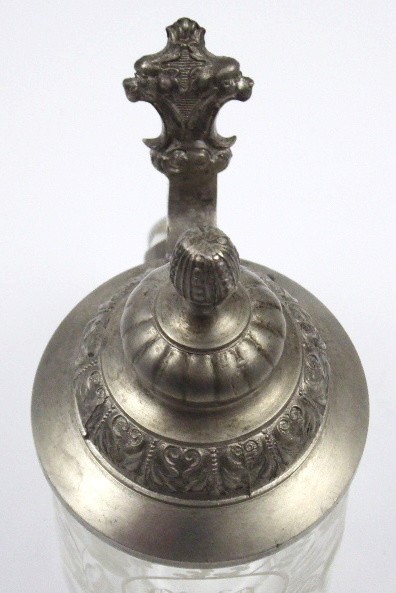 Čiré ručně broušené sklo, cín. Korbel z čirého skla s ručně broušeným centrálním medailonem se stylizovaným monogramem MD a datací 1895. Z medailonu vybíhající ručně broušené listy s úponky. Spodní část korbelu je dekorována ručně broušenými oválnými fazetami. Zdobné cínové víko s okružím korunuje stylizovaný žalud. Čechy, rok 1895. Výška 18 cm.