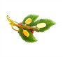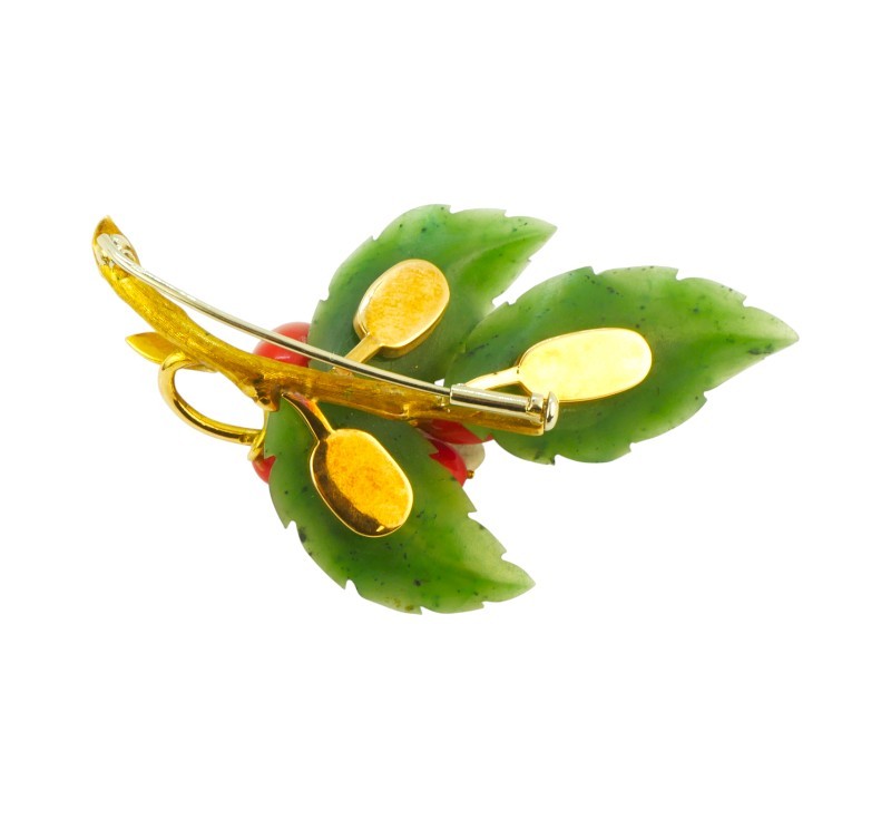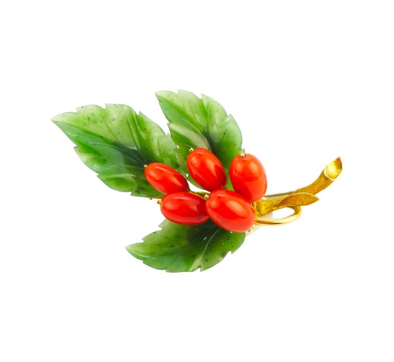 Větvička hlohu - brož zhotovená ze žlutého zlata ryzosti 585/1000, plody hlohu z mořského korálu, lístky z nefritu. Rozměr brože 7 x 4,3 cm, celková hmotnost 22,03 g.
