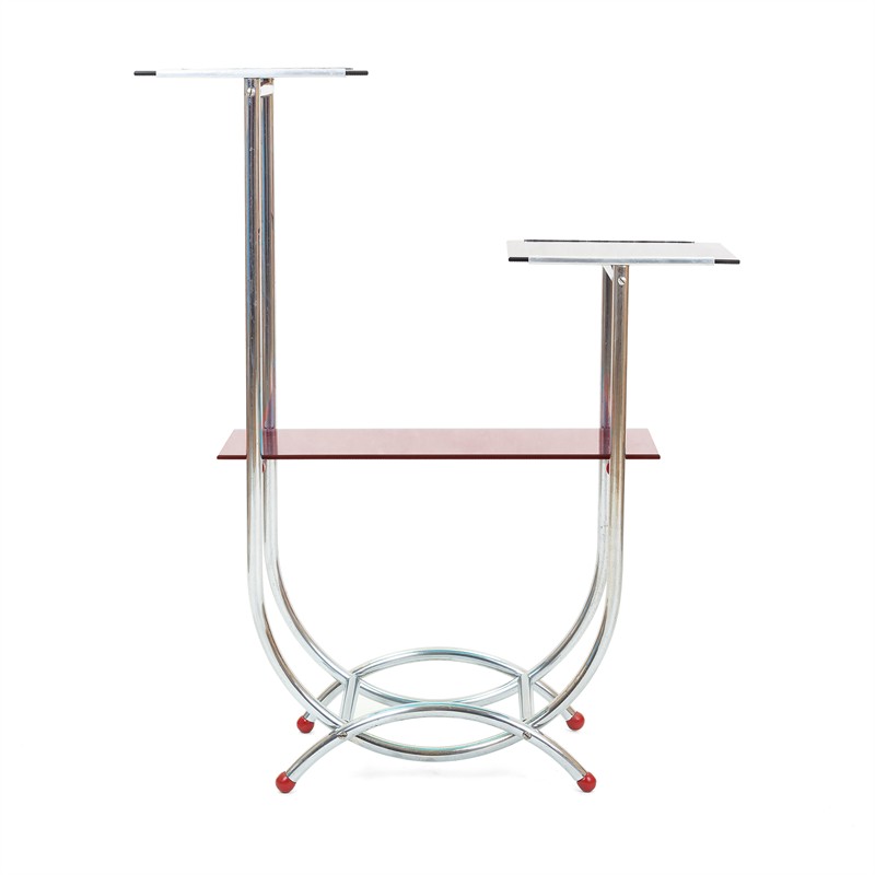 Období-Funkcionalismus Datování-1930 Původ-Čechy Výrobce-Hynek Gottwald Materiál-chromovaná trubka, opaxitové sklo Rozměry-v 100. š 80. h26. Stav-restaurován původní originál Poznámka-katalogový model, výjimečná barva opaxitu Doručení-zajistíme po dohodě