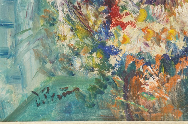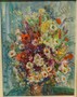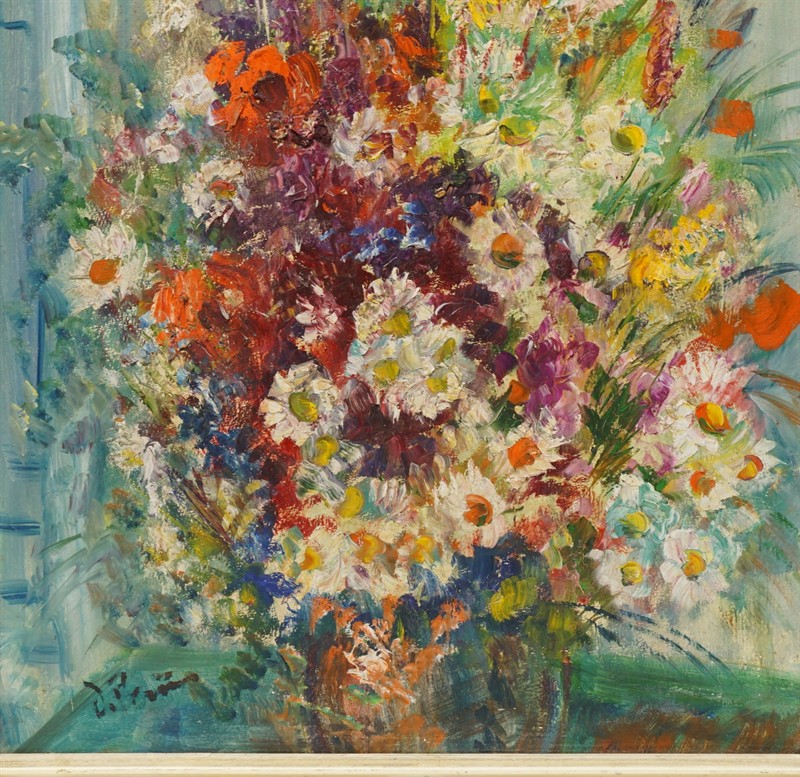 Velice dekorativních dílo většího formátu v pestrých barvách s motivem květů ve váze. Galerijní práce z poloviny minulého století, olejomalba na kartonu od známého východočeského malíře - Václav PEŘINA (*1907 +1979), převážně krajinář i autor mnoha vynikajících zátiší. Sign. l.d. v původním masivním rámu (drobné oťuky), jinak velmi dobrý stav. Celkový rozměr - 84 x 67cm, rozměr díla - 71 x 55cm