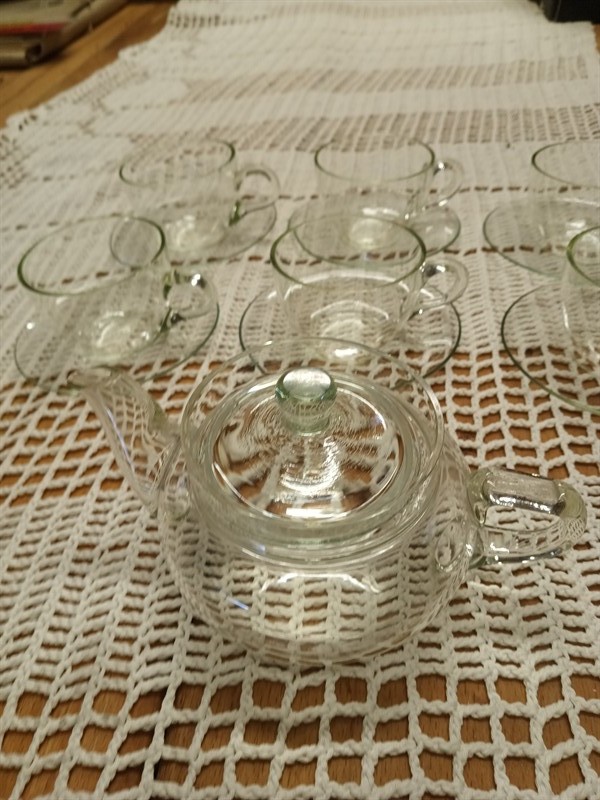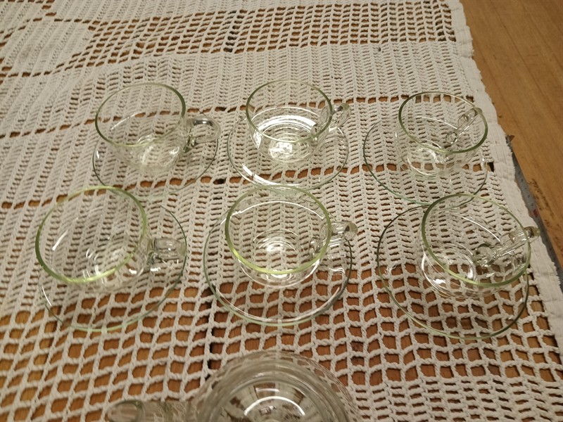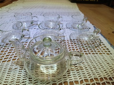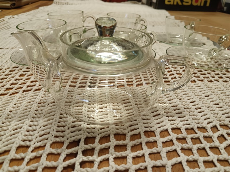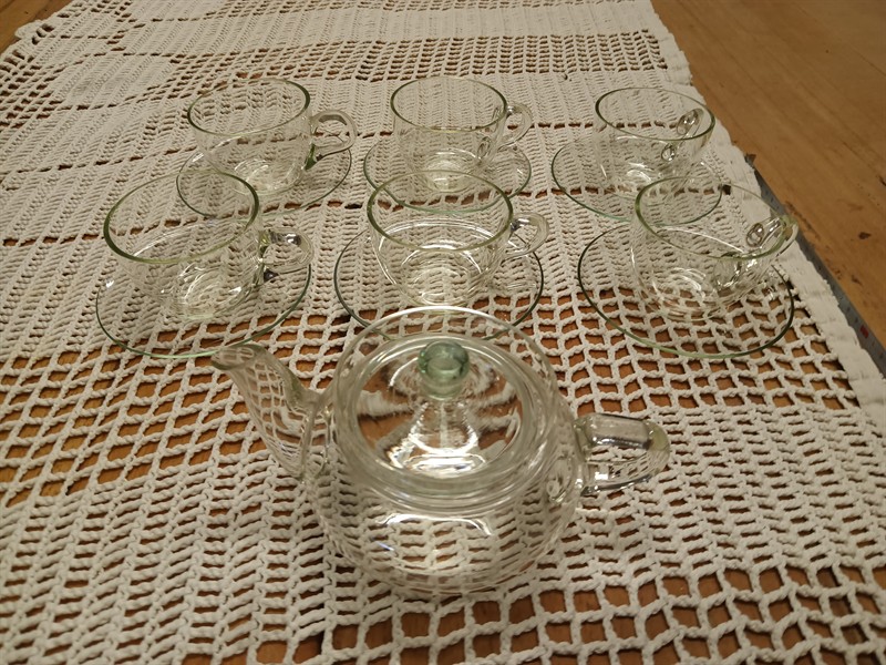 Čajový servis - L Sutnar - 6 x šálek s podšálkem , 1x konvička . Sklo má nazelenalý odstín , čímž se odlišuje od moderních replik .